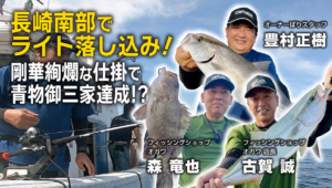 長崎県権現沖から「遊漁船 第八文丸」さんにお世話になり「オーナーばり」豊村正樹による落とし込み釣りをお届けします!ゲストに「フィッシングショップオガワ」古賀誠店長&スタッフ森竜也さんをお迎えしていざ出船!!ポイント到着即座にベイトがついてヒット!シーズンインにはまだ少し早いタイミングだがベイトさえ付けば本命が喰う確率が高い。青物御三家に根魚と好釣果♪渋い時間帯は落とし込み仕掛けをチェンジしながら検証~潮が動かないタイミングには 船長のはからいで世界遺産軍艦島をクルージング♪♪観光も楽しんだ落とし込み釣りの模様をご覧ください。