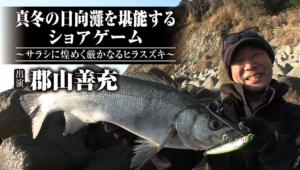 宮崎県南部、国定公園に指定されている風光明媚な日南海岸に白波打ち寄せる…総延長、南北に約100キロ。黒潮の恩恵を享受する日向灘に面した海岸からは、四季折々、多彩な魚が狙える。南国の潮騒切り裂くキャストで、難敵ヒラスズキに挑むのは宮崎市に暮らす熟達のアングラー郡山善充さん。釣りは仕事が休みの土日のみ…奥様と娘をこよなく愛するヒラスズキハンターとして、地元ではちょいと名の知れた存在だ。地合いとヒットルアーを見極めて…サラシに煌めくヒラスズキを狙い撃つ。